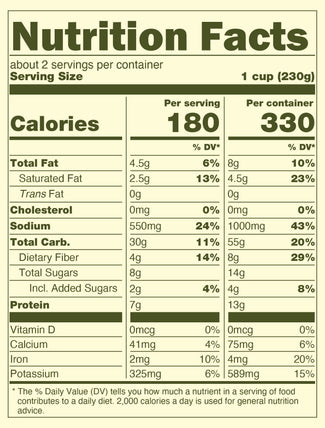 Vegetable Broth (Water, Mirepoix Extract [Onions, Leeks, Water, Celeriac, Celery, Carrots, Tomatoes, Potatoes, Parsley, Garlic, Bay Leaves, Rosemary] Sea Salt, Water, Yeast Extract, Tomato Paste, Thyme), Butternut Squash, Red Lentils, Onions, Organic Coconut Milk (Organic Coconut, Water, Organic Guar Gum), Green Lentils, Carrot Extract, Maple Syrup, Rice Bran Oil, Lemon Juice (Water, Lemon Juice Concentrate), Reduced Sodium Sea Salt (Sea Salt, Potassium Chloride), Diaspora Mustard Seed, Diaspora Coriander Seed, Diaspora Turmeric and Spices.